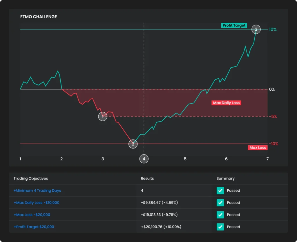 This structure summarizes the FTMO Challenge rules for each account size. Simply choose your desired amount and follow the corresponding limits. The challenge has an unlimited duration, but requires a minimum of four trading days. There are two risk limits: the maximum daily loss and the maximum total loss, which cannot be exceeded. To be approved, you must reach the profit target for your chosen account. The initial fee is fully refunded if the trader completes the process and becomes an FTMO Trader.